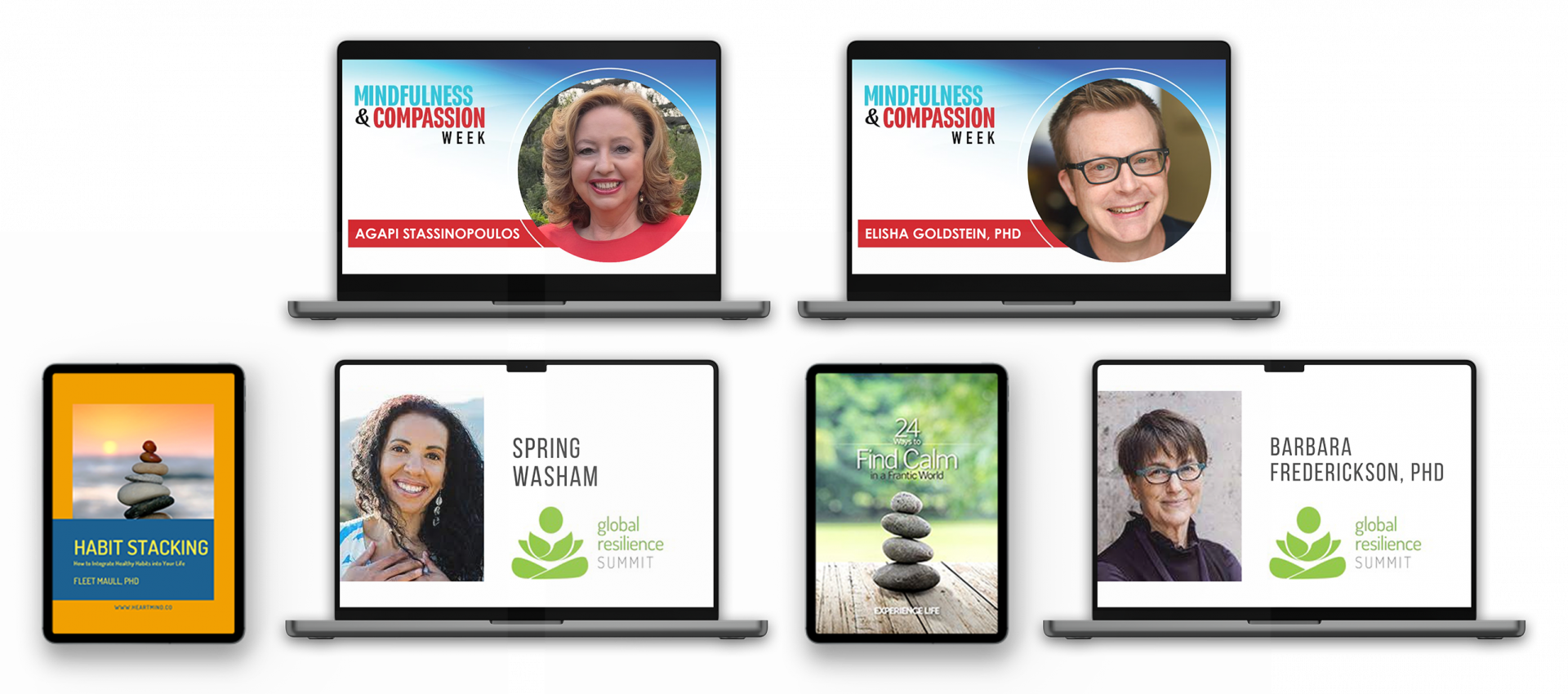 Four Previous Summit interviews with Barbara Frederickson, PhD, Spring Washam, Agapi Stassinopoulos and Elisha Goldstein, PhD to watch today! Plus Download The 24 Ways to Find Calm in a Frantic World ebook and Habit Stacking ebook!
